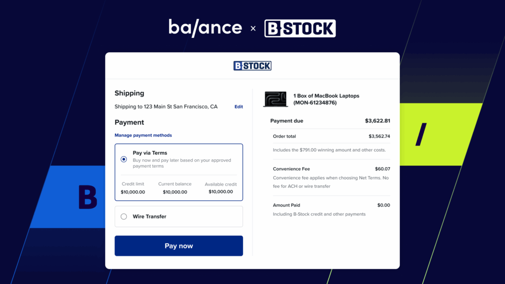 By integrating Balance’s technology, B-Stock is introducing an enhanced, fully embedded payment experience that gives buyers more choice, a frictionless checkout, and faster order processing, all through a white-labeled interface that fits seamlessly into B-Stock’s B2B resale platform.